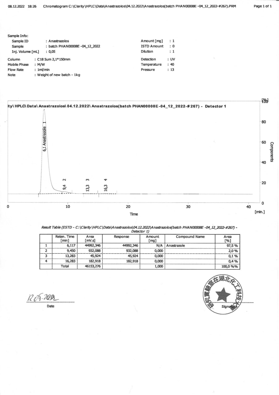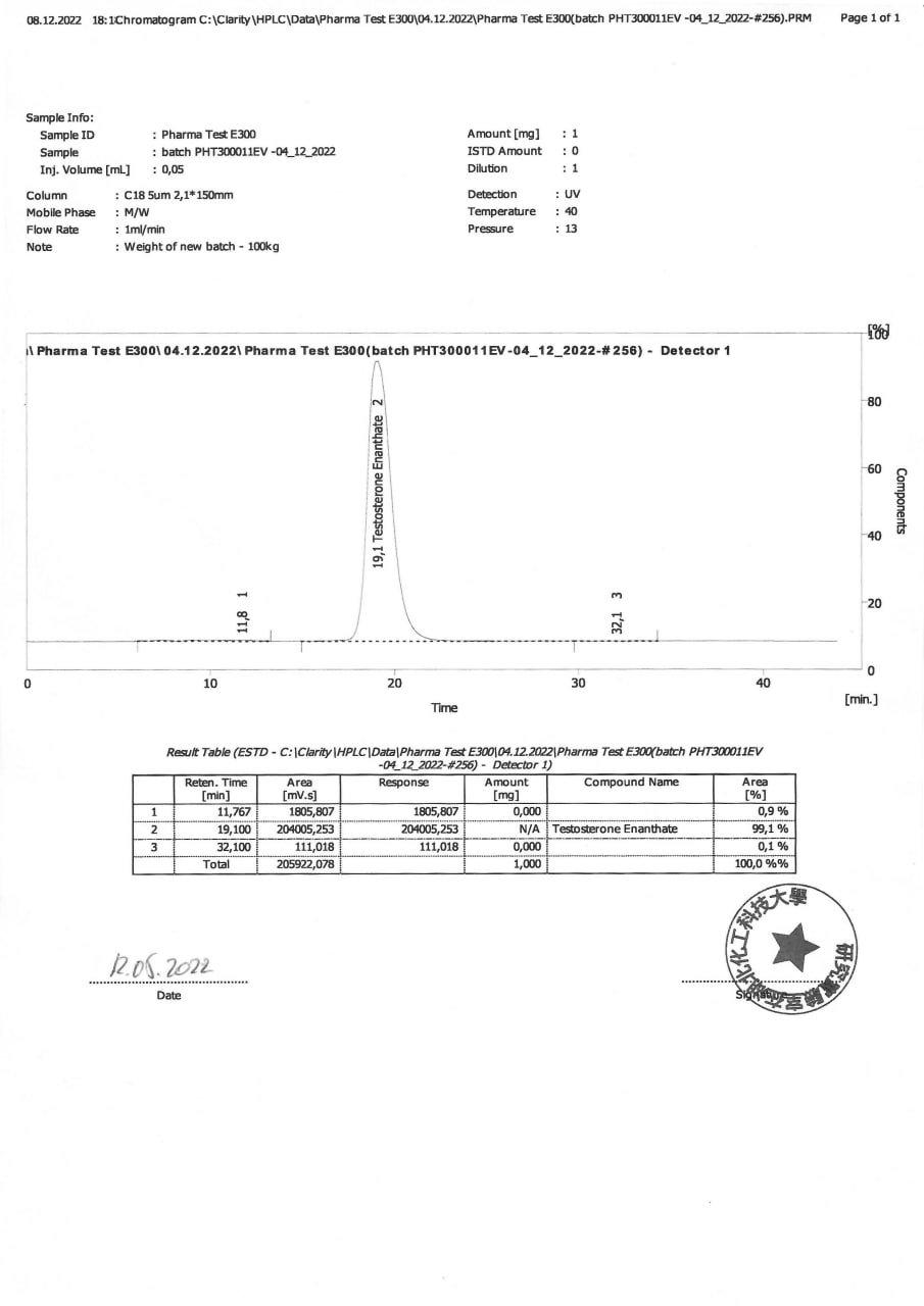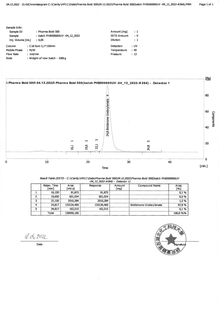 Fast alle Chromatographie-Tests wurden von einem unabhängigen, GMP-zertifizierten akkreditierten Labor Simec (www.simec.ch) durchgeführt. Alle Ergebnisse sind überprüfbar!!! In jedem Bericht gibt es eine individuelle Berichtnummer, zum Beispiel C34804 für Boldenon Undecylenat. Wenn Sie Zweifel an der Qualität haben, können Sie sich direkt an Simec wenden, diese Berichtnummer angeben und sie werden die Authentizität des Berichts bestätigen.